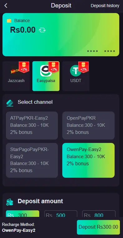 Deposit Limits: Minimum deposit starts from as low as PKR 100. Maximum deposit varies based on your account and VIP level.