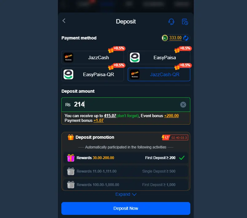 The app supports local payment methods like JazzCash and EasyPaisa accepted with zero fees. This makes the deposit and withdrawal process within minutes very effortless for the local user.